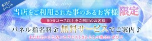 いつもご利用頂きましてありがとうございます♪当店のリピーター様限定イベント!パネル指名料金無料でご案内させていただきます♪必ず【公式イベント】とお伝えくださいね♪まだお会いしてないセラピストさんとこの機会にいかがでしょうか?当店自慢のセラピストさんがオイルを抱えてお待ちしておりますよ~♪